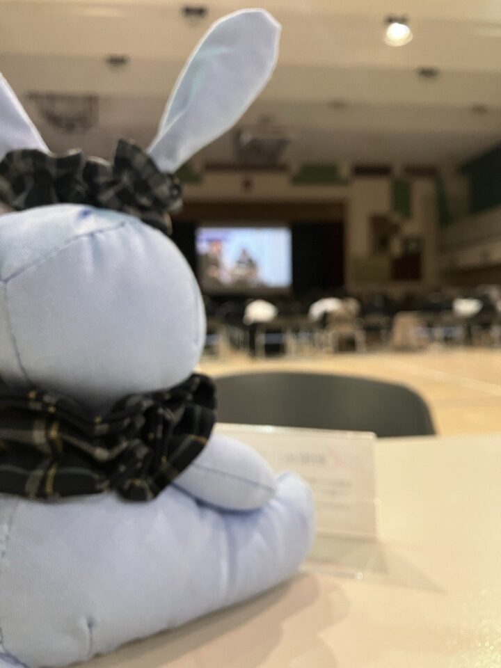 (卒業生制作の「制服ぬいぐるみ」も学校説明会を見守っていました)