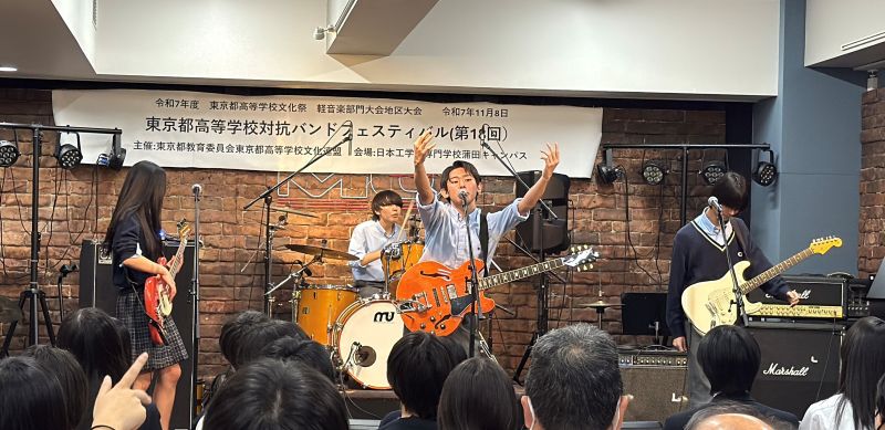 11月8日(土)、日本工学院専門学校蒲田キャンパスで行われた、令和7年度東京都高等学校文化祭軽音楽部門大会の地区大会(予選)に二年生バンド「氷菓」が出場し、オリジナル曲「XeNo」を披露、結果、見事に予選を突破し中央大会(都大会)進出を決めました!