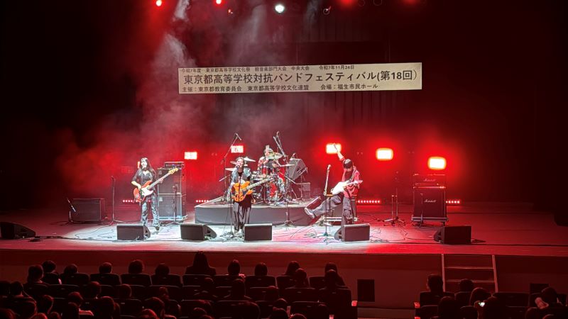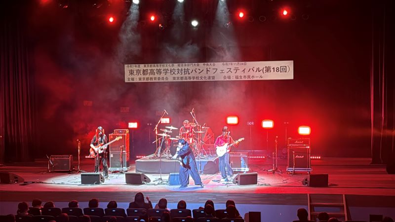 11月24日(月)、福生市民会館大ホールにて行われた「令和7年度東京都高等学校文化祭軽音楽部門大会」の中央大会(都大会決勝)に、厳しい予選審査を勝ち抜いた二年生バンド「氷菓(ひょうか)」が出場しました。