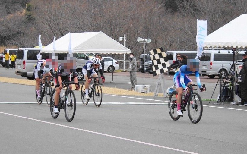 中盤には正則の2人も懸命にトップ3人の追走を試みますが、ブリッジは掛からず25名程度のメイン集団でレースを展開します。トップ2人(愛媛県と京都府の選手)のペースは凄まじく、後方を1分以上引きちぎり、2人のマッチレースはファイナルラップまで続きました。トップからは離されたものの、正則2人のランデブー走行は途切れず、7位争いの集団で最終ラップに突入します。通常のレースでは登り地点のゴールですが、今回はスタートアンドフィニッシュが同一の下り地点の為、最高速付近でのゴールスプリントとなります。