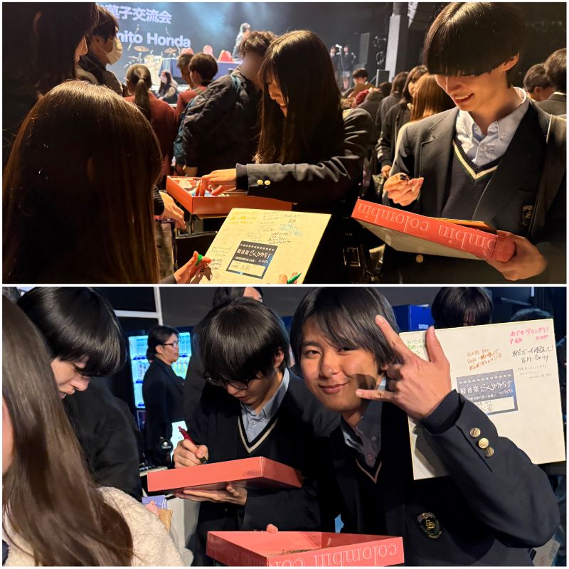 各自持ち寄ったご当地のお菓子を持って挨拶をしつつ、会場で配られた色紙にコメントを書いてもらいます。始めは遠慮がちだった氷菓のメンバーですが(ロックなパフォーマンスとは違い、シャイなメンバーが多いのです笑)最後は積極的に交流をしていました。
