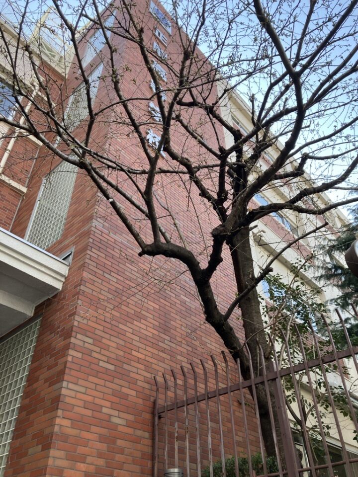 先日、東京の桜開花宣言がなされたので、正則の正門横の桜はどんな様子だろう?と、観察してみました。