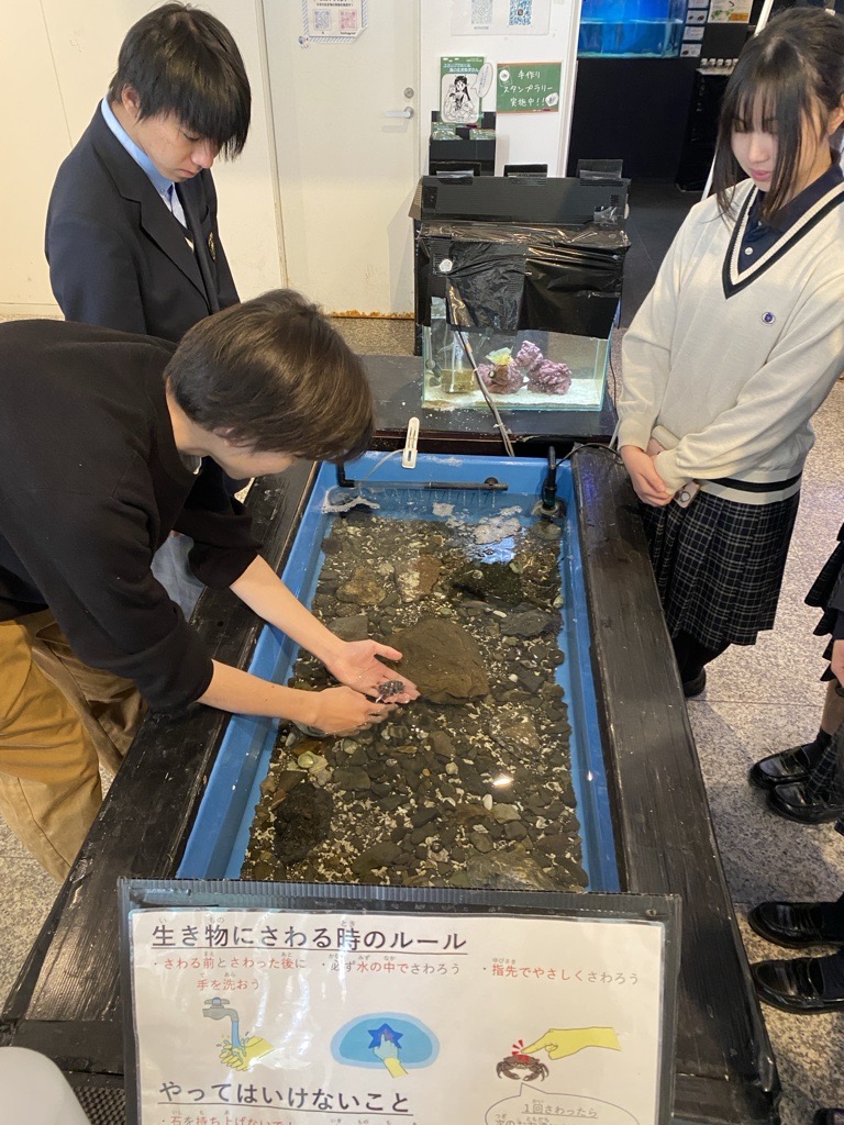 実験施設の説明や海洋生命科学部の学生さんが運営管理を行っている北里アクアリウムラボを見学させていただき、生徒たちは目をキラキラさせながら館内をまわっていました。