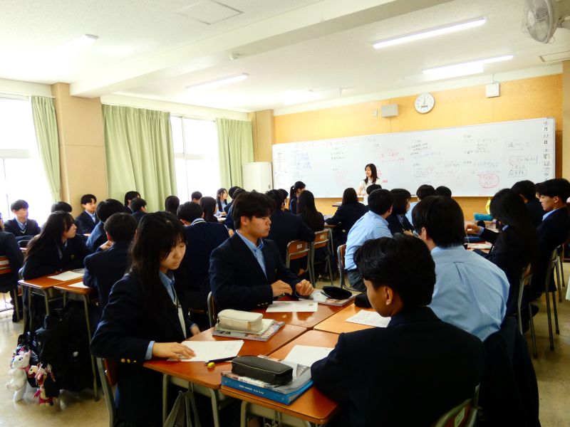 クラスを半分に分けた少人数編成で実施しています。今日はガイダンスに加え、簡単な表現練習も。先生やクラスメートと顔を合わせる機会が多い環境を活かし、三年間でしっかりと「表現できる力」を磨いていきます。