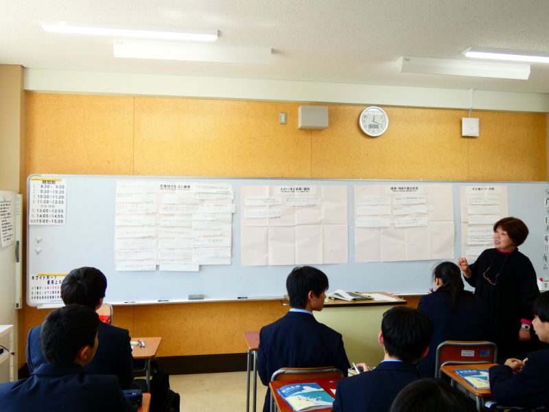 先生二人が連携して授業を進める「ティームティーチング」です。今日は「暮らしと環境」で関心があることを短冊に書き、カテゴリー分けをしました。自分の関心がどのジャンルに属するのかを視覚的に整理する、ユニークな導入となりました。